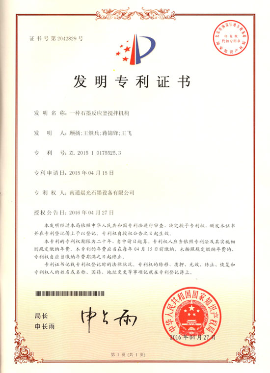發(fā)明專利 :一種石墨反應(yīng)釜的攪拌機構(gòu) 專利號:ZL 2015 1 0175525.3