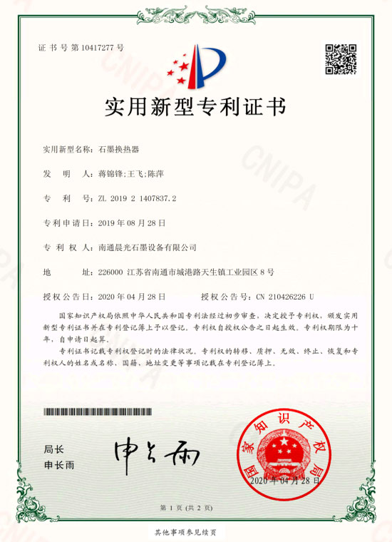 實(shí)用新型專利 :石墨換熱器 專利號(hào):ZL 2019 2 1407837.2